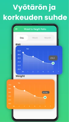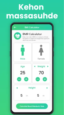 Tarkastele kehosi koostumusta vaivattomasti Terveyslaskin-sovelluksen BMI-laskurilla. Se auttaa sinua ymmärtämään, sijoittuuko painosi alipainon, normaalipainon vai ylipainon kategoriaan ikäsi ja pituutesi perusteella. Tämä oivaltava työkalu antaa sinulle perustan terveellisten elämäntapapäätösten tekemiseen. Syvenny kehosi energiankulutukseen BMR-laskurin avulla. Se paljastaa kalorimäärän, jonka kehosi tarvitsee perustoimintojensa ylläpitämiseen levossa. Tämän tiedon avulla voit suunnitella ravintoasi tarkemmin ja tukea tavoitteitasi, olipa kyseessä painonhallinta tai yleinen vitaliteetti.
