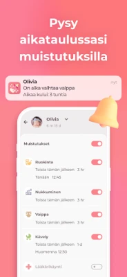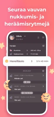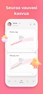 Imetys ja Baby Tracker Erby ulottuu perushoitoa pidemmälle. Pidä tarkkaa kirjaa lapsen terveydentilasta merkitsemällä oireet, lämpötilan, lääkitykset, vitamiinit ja rokotukset. Seuraa lapsen kasvua ja painonkehitystä, ja ole tietoinen hampaiden puhkeamisen edistymisestä – nämä tiedot ovat korvaamattomia lastenlääkärin vastaanotolla. Lisäksi voit kirjata kaikki tärkeät aktiviteetit, kuten kylvyt, ulkoilut, vatsa-ajan, leikit ja hieronnat, luoden kokonaisvaltaisen kuvan lapsen päivästä. Sovelluksen kattavat tilastot ja historiatoiminnot auttavat sinua tunnistamaan säännöllisyyksiä ja suuntautumisia, jotta voit hienosäätää hoitorutiineja. Muistutusten ansiosta tärkeät hetket, kuten syötöt tai lääkeannokset, eivät unohdu. Tämä ainutlaatuinen työkalu on suunniteltu useamman lapsen, jopa kaksosten, seurantaan, tarjoten tukea jokaiseen perheen dynamiikkaan. Se on paljon enemmän kuin pelkkä kehityspäiväkirja – se on muisto lapsesi kallisarvoisista ensimmäisistä kuukausista.