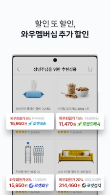 Löydä haluamasi helposti Coupangin intuitiivisen hakutoiminnon ansiosta ja tee harkittuja päätöksiä miljoonien käyttäjäarvostelujen avulla. Haluatko löytää parhaat tarjoukset? Coupang kokoaa kaikki saatavilla olevat kupongit yhteen paikkaan, jotta voit vaivattomasti valita itsellesi sopivimmat alennukset. Kansainväliset ostokset eivät ole koskaan olleet näin suoraviivaisia; Coupangin avulla voit tilata tuotteita ulkomailta ja saada ne kotiovellesi jopa kolmessa päivässä, tehden kansainvälisestä kaupasta edullista ja vaivatonta. Maksa 'Coupaylla' vaivattomasti yhdellä kosketuksella ja hyödynnä samalla houkuttelevia etuja. Suunnittele seuraava lomasi Coupangin matkailuosaston kautta, joka tarjoaa tuhansia majoitusvaihtoehtoja, lentoja, autonvuokrauksia ja lippuja sekä kotimaan että ulkomaan matkoille. Hanki säännöllisesti tarvitsemasi tuotteet edullisemmin 'määräaikaistilauspalvelun' avulla, välttäen perinteisten ruokaostosten vaivan.