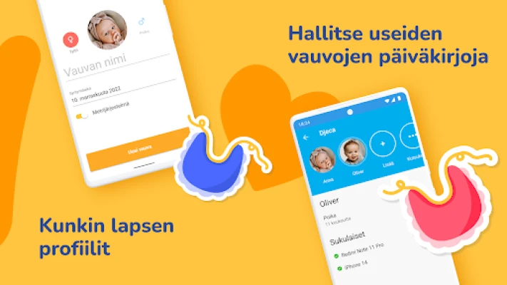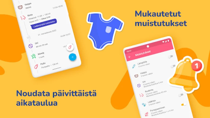 Työkalumme avulla voit vaivattomasti tallentaa ja seurata kaikkia vauvasi elintärkeitä toimintoja. Olipa kyseessä imetys – yhdeltä tai molemmilta rinnoilta – pulloruokinta tai kiinteiden annosten tyyppi ja määrä, kaikki tallentuu tarkasti. Myös maidonpumppauslokilla pidät kirjaa pumpatuista määristä. Pidä silmällä vaipanvaihtoja, merkitse märät, likaiset tai molemmat, ja tiedä aina päivittäinen vaippamäärä. Lisäksi voit kirjata ylös kylvyt, lämpötilat, ulkoilut ja lääkitykset. Kätevät ajastimet, kuten imetys- ja uniajastimet, ovat helposti käytettävissä ja keskeytettävissä, ja ne pysyvät näkyvissä ilmoituspalkissa nopeaa pääsyä varten.